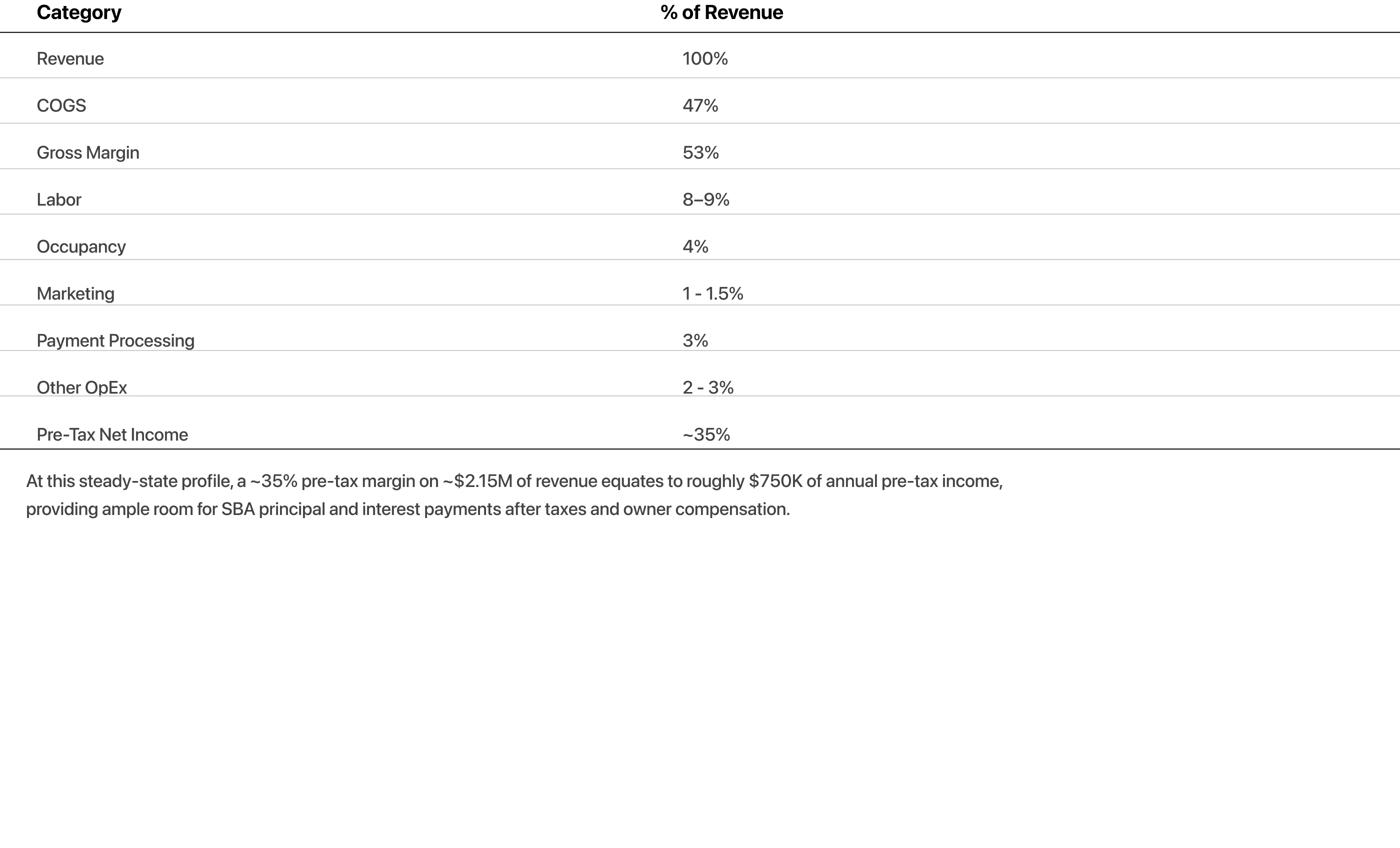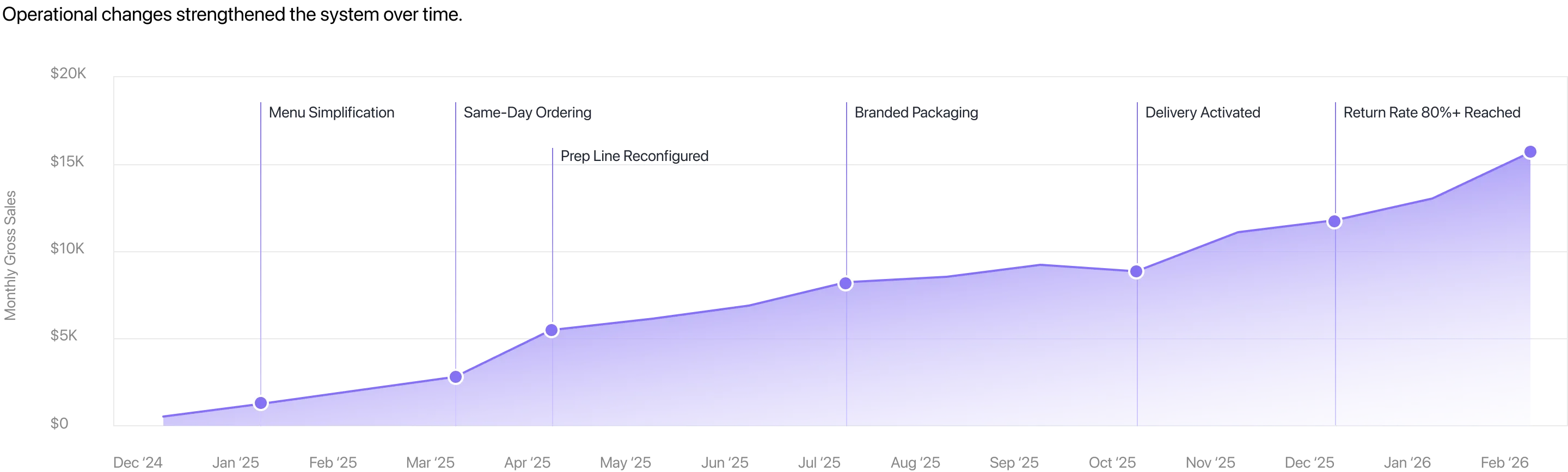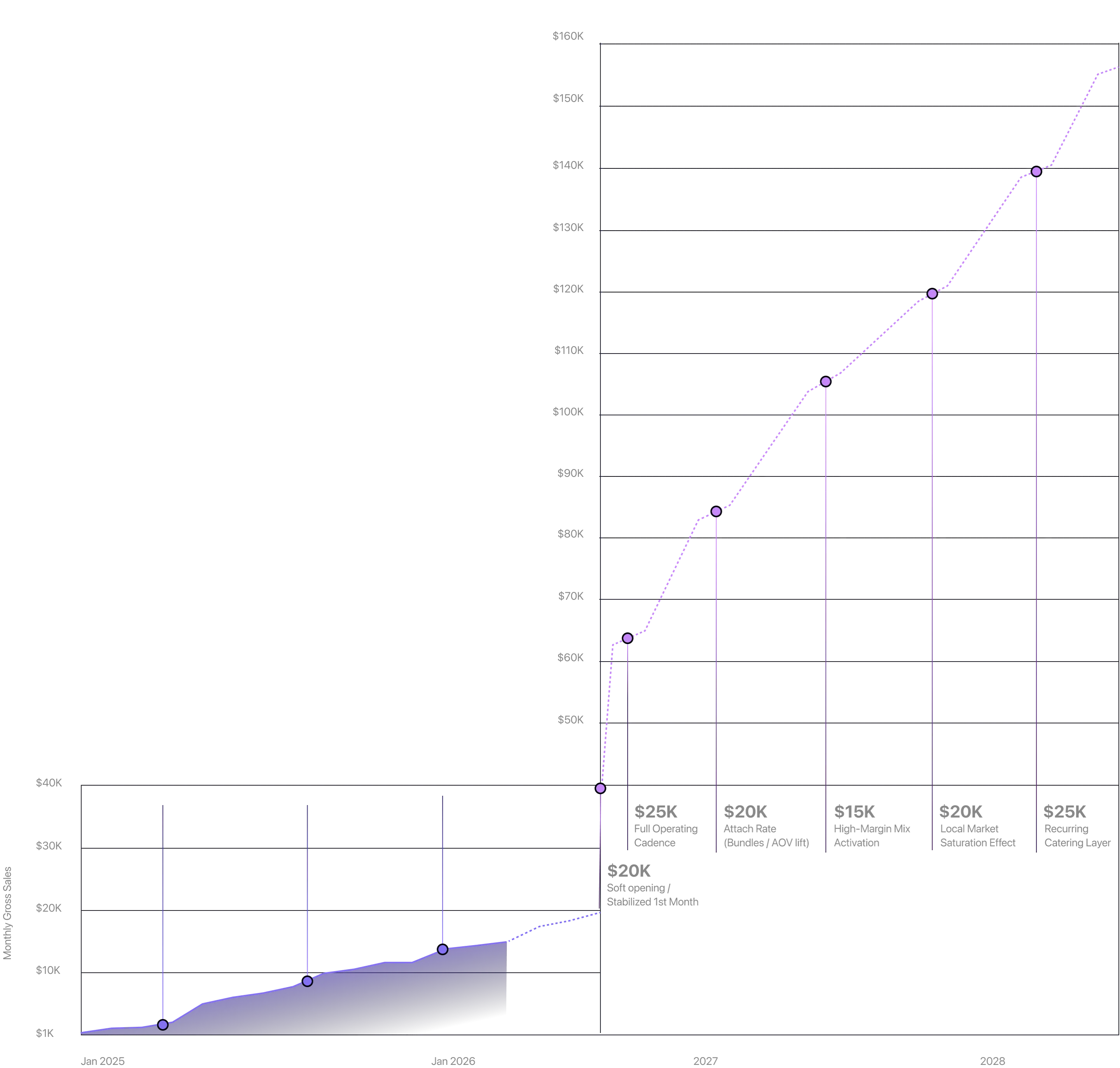 This timeline shows how one location scales the same way a product does — through sequential unlocks. We move from validated pilot demand to full retail operations, then layer in improvements like expanded hours, better order composition, higher-margin mix, and recurring catering.